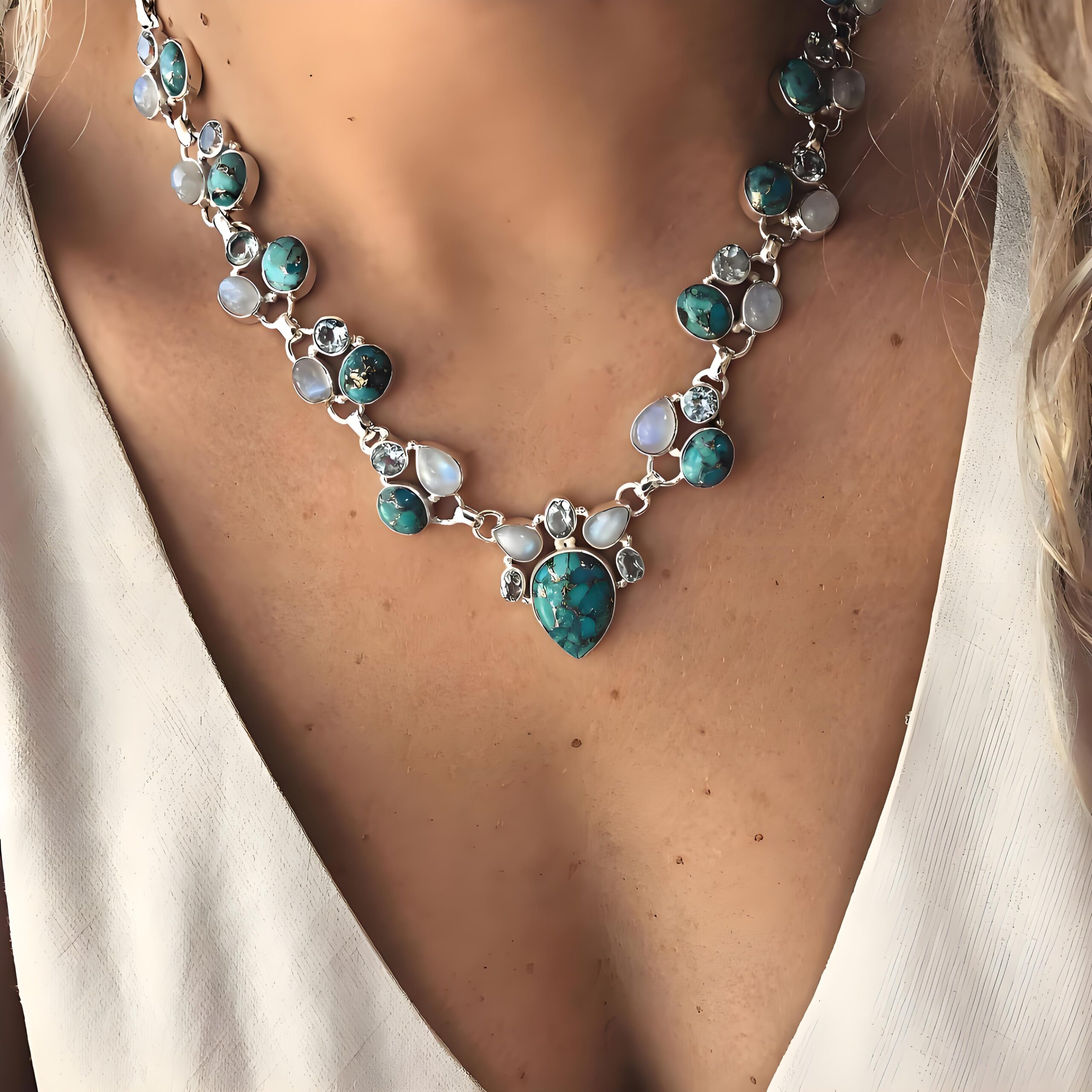 Transform your look with the Bohemian Turquoise Necklace! Vibrant turquoise stones and floral accents create a unique, eye-catching piece. Elevate your style today!